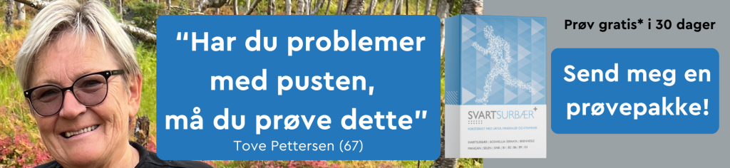 "Jeg hadde lenge utfordringer med pusten, men etter at jeg begynte med Svartsurbær+ har det blitt en merkbar forskjell. Jeg trenger ikke like mye hjelpemidler som før, og hverdagen føles lettere. Jeg føler meg mer energisk og deltar mer i det sosiale livet. Svartsurbær+ har virkelig hjulpet meg, og jeg anbefaler det varmt til andre med pustevansker.".