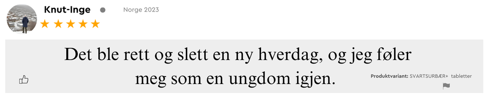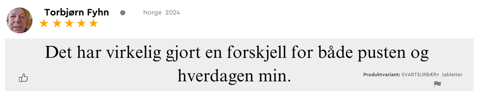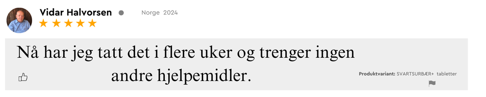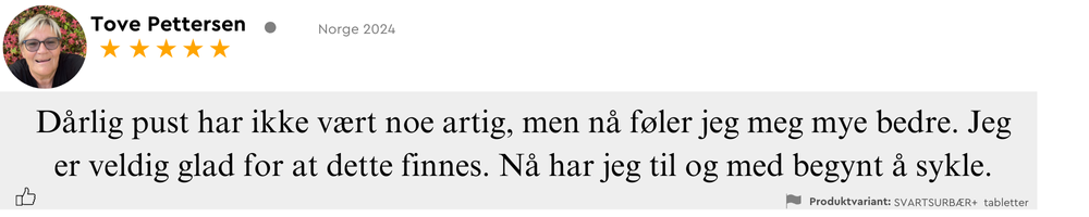 “Jeg fikk mer energi og opplevde at pusten føltes friere etter at jeg begynte med Svartsurbær+. Det er enkelt å ta, passer godt inn i hverdagen min, og jeg har allerede anbefalt det videre til flere.”